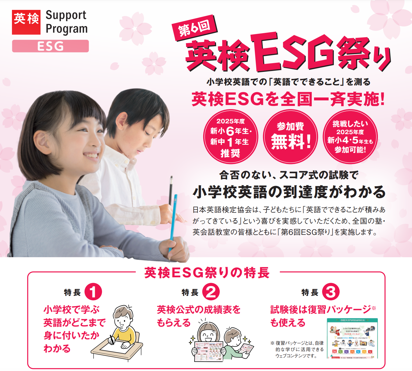 公益財団法人日本英語検定主催、英検ESGの当校の受験者を募集します。 お子さ …